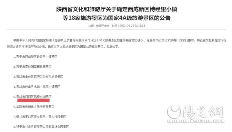 阳光讯(记者 芮扬 通讯员 燕智鹏)日前,陕西省文化和旅游厅公布18家国家4A级旅游景区名单,宝鸡市凤翔区东湖景区榜上有名,实现了凤翔区高A级景区“零”的突破。
